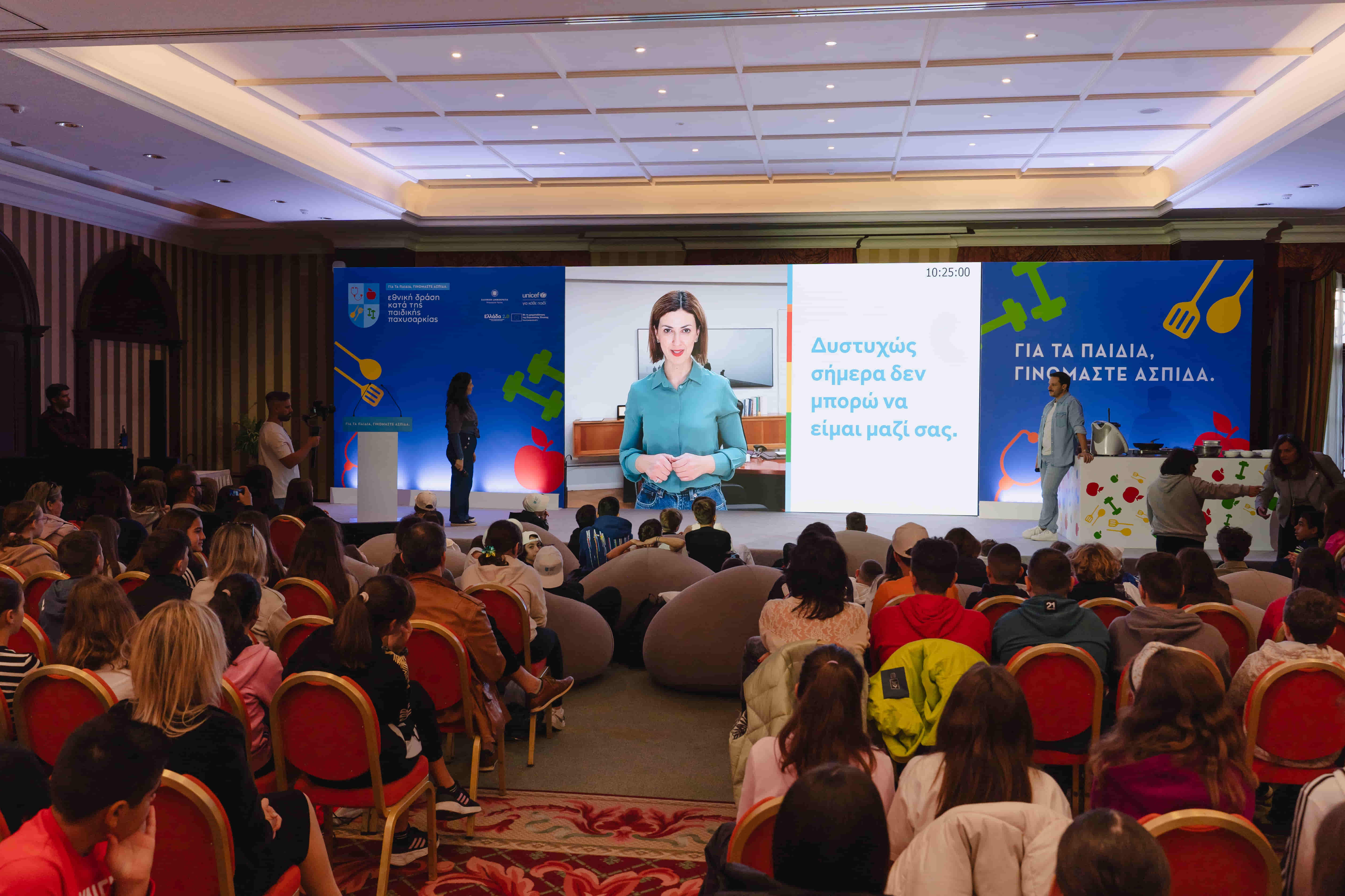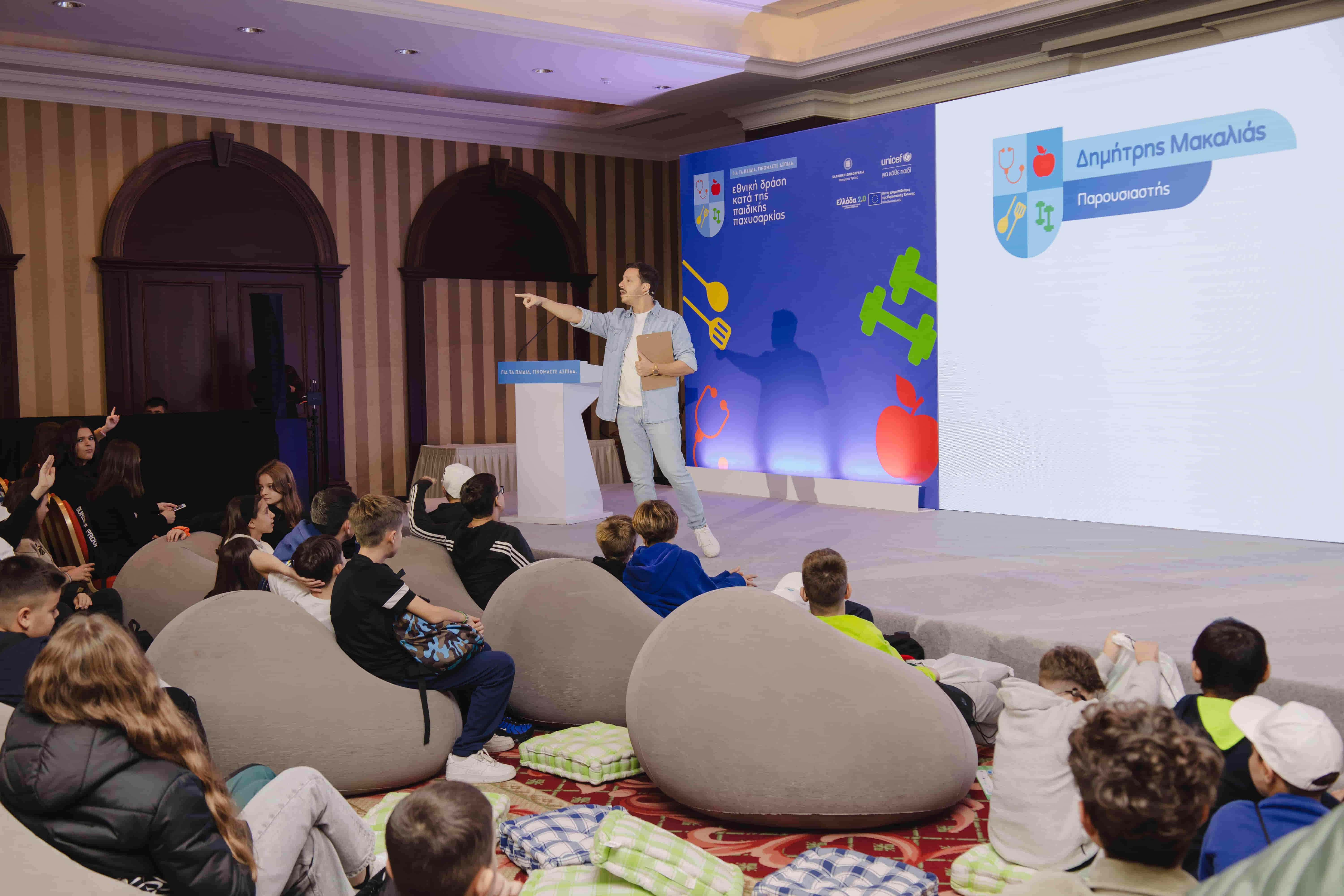 Τους μαθητές υποδέχτηκαν ο Δημήτρης Μακαλιάς και η Ελευθερία Μπενοβία, παρουσιάζοντας την Εθνική Δράση κατά της Παιδικής Παχυσαρκίας, ενώ ο σεφ Γιώργος Τσούλης ετοίμασε μαζί με τα παιδιά γευστικές και υγιεινές συνταγές. Παράλληλα, ο διαιτολόγος- διατροφολόγος Βάιος Σβώλος μοιράστηκε έξυπνες συμβουλές για μια πιο ισορροπημένη διατροφή.